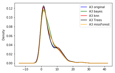 labels = ['A3 original', 'A3 bayes', 'A3 knn', 'A3 Trees', 'A3 missForest']