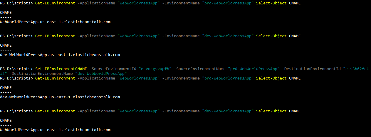 PS D:\scripts> Set-EBEnvironmentCNAME -SourceEnvironmentId "e-vncgsvupfb" -SourceEnvironmentName "prd-WebWorldPressApp" -DestinationEnvironmentId "e-s3b62feki2" -DestinationEnvironmentName "dev-WebWorldPressApp"