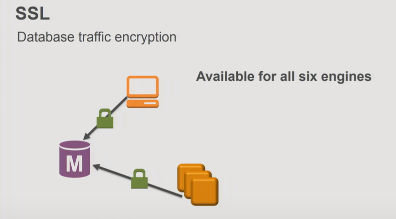 Many compliance bodies have requirements around data protection and the encryption of data in transit and at rest. In order to satisfy these regulatory requirements, RDS provides you with options to encrypt data while in transit and at rest. You can enable SSL for all the database engines, so that your data is encrypted going into and out of the database, to meet your compliance requirements.