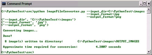 The following screenshot shows the image conversion utility in action on Windows XP, that is, running image converter from the command line.