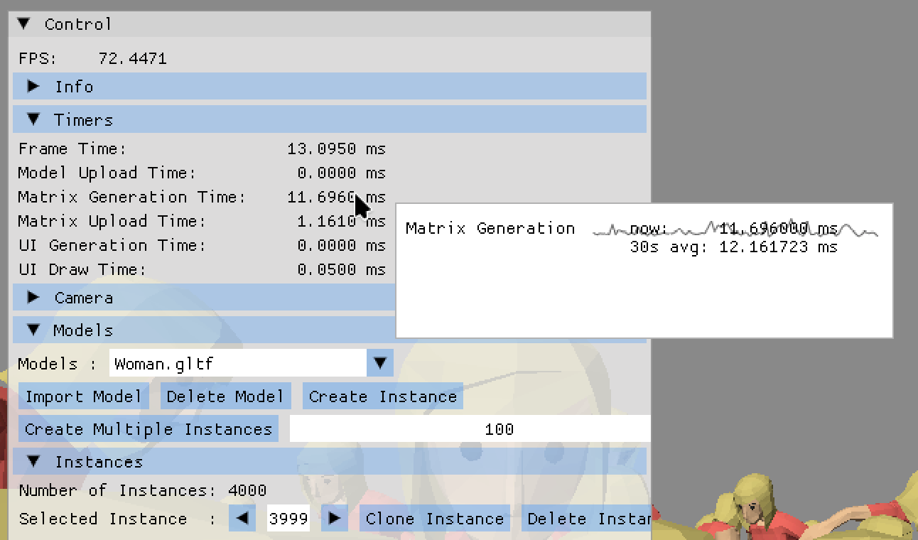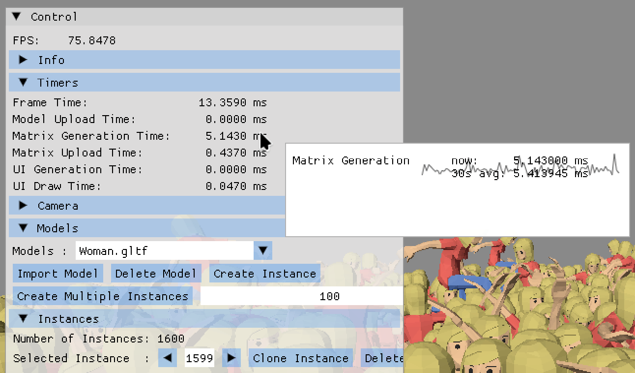 All features and the user interface are identical to Chapter 1. But our changes can be made visible by adding more and more instances. If you add the same 1,600 instances as in Figure 2.1, you will see much smaller matrix generation times. The values may be similar to Figure 2.5: