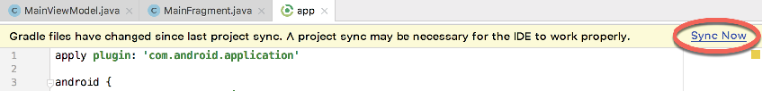 Once the entry has been added, a yellow bar will appear across the top of the editor screen containing a Sync Now link. Click this to resynchronize the project with the new build configuration settings: