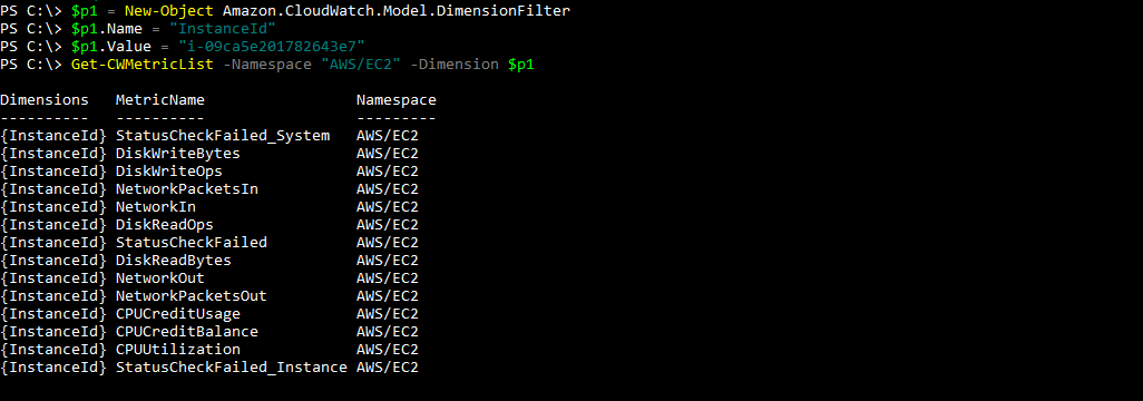PS C:\> Get-CWMetricList -Namespace "AWS/EC2" -Dimension $p1
