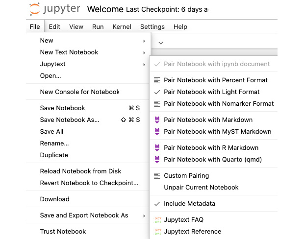 Now we’ve launched the Jupyter browser again, open the Welcome notebook. Go to the File | Jupytext menu. Here is what it looks like:
