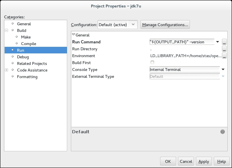 The first step is to set up an executable that will run. Go to Run | Set project configuration / Customize and then Build | Make, and set build/linux-amd64-debug/hotspot/outputdir/linux_amd64_compiler2/jvmg/gamma as the build result, as shown in the following screenshot: