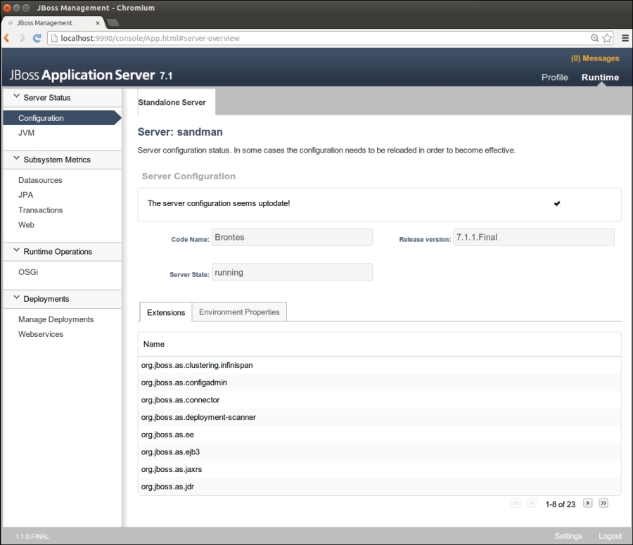 JBoss AS (Application Server) 7 is an open source application server from RedHat. JBoss AS 7 implements the JEE 6 specifications, which include the Java Servlet and JavaServer Pages specifications, as well as other parts of the JEE6 specification. The latest community version of the JBoss AS 7 server is 7.1.1 Final, and it will be used for the examples in this chapter.