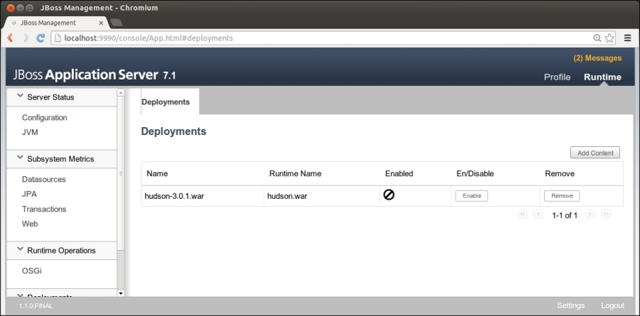 We will cover four different ways to install Hudson. You can read each of the sections to compare deployment methods, or you can skip to the section that covers your preferred method of running the Hudson web application. The important thing is, that we have a working Hudson installation by the end of this chapter.