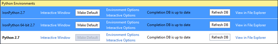 In the example shown in the preceding screenshot, there are actually two interpreters. This is because the 64-bit version of IronPython is installed, which results in the installation of both the 32-bit and 64-bit versions on the machine.