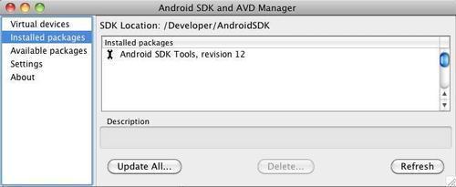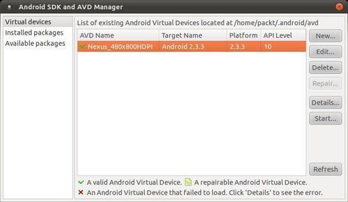 We have also launched the Android SDK and AVD manager, which aims at managing SDK components installation, updates, and emulation features. This way, new SDK API releases as well as third-party components (for example, Samsung Galaxy Tablet emulator, and so on) are made available to your development environment without having to reinstall the Android SDK.