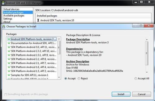The Android SDK and AVD Manager is launched. The Package installation window appears automatically.