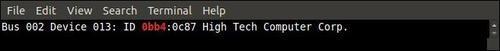 0bb4is the HTC Vendor ID and0c87is the HTC Desire product ID:$ lsusb | grep 0bb4