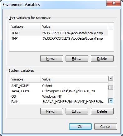 ANT_HOMEvariable with theAntdirectory as the value. Append the%ANT_HOME%\bindirectory toPATH: