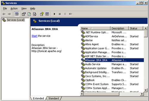 service.bat install JIRAThis will install JIRA as a Windows service. The name of the service will be Atlassian JIRA, followed by the name you supplied after the install command. So in our example, the name of the service will be Atlassian JIRA JIRA.