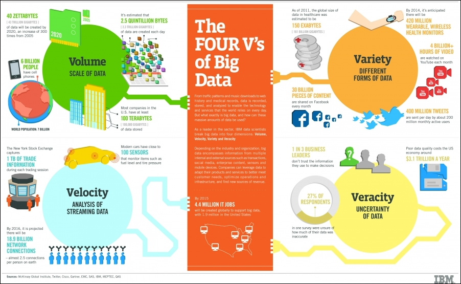 The 4th characteristic of big data â veracity, which was added later, refers to the need to validate or confirm the correctness of the data or the fact that the data represents the truth. The sources of data must be verified and the errors kept to a minimum. According to an estimate by IBM, poor data quality costs the US economy about $3.1 trillion dollars a year. For example, medical errors cost the United States $19.5 billion in 2008; for more information you can refer to a related article at http://bit.ly/1CTah5r. Here is an info-graphic by IBM that summarizes the 4V's of big data: