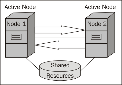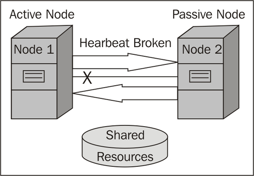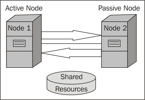 The most common and widely used configuration is called an Active/Passive cluster (Single-instance Failover Cluster). There will be two nodes that are configured as a cluster node, and one of them is active and the second will remain passive or idle. In case of failure of any kind on Node 1, it fails over to second (or passive) server and now Node 2 will become the primary or active node for the cluster. Refer to the following scenario. If there is a failure in the active node the Heartbeat (refer to the How clustering works section) will be interrupted and ownership of the any resources will be taken by Node 2, which was passive: