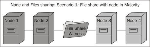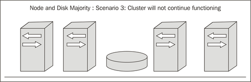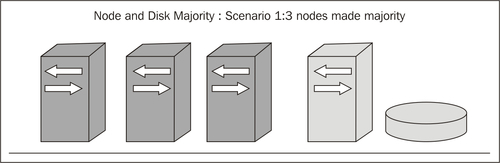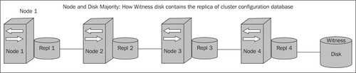Node and Disk Majority: In this configuration, every cluster node plus a designated disk (as a witness) can vote, and here too if more than 50 percent votes are calculated to keep running as a cluster, the cluster will continue to function. This means if there is a four-node cluster with a disk witness, the total number of disks adds up to five as there are four disks on the system plus one witness disk; so, in this case, the cluster will continue to work if three or more votes come.