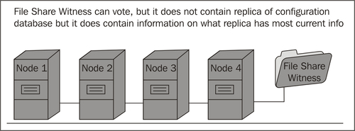 Node and File share majority: In this mode, there will be a designated file share that is created as a file share witness. There will be a replica for each of the shares, which is kept on a system disk across all the nodes; however, this is not stored on the file share, which is the core difference between node and disk majority and disk and file share majority.