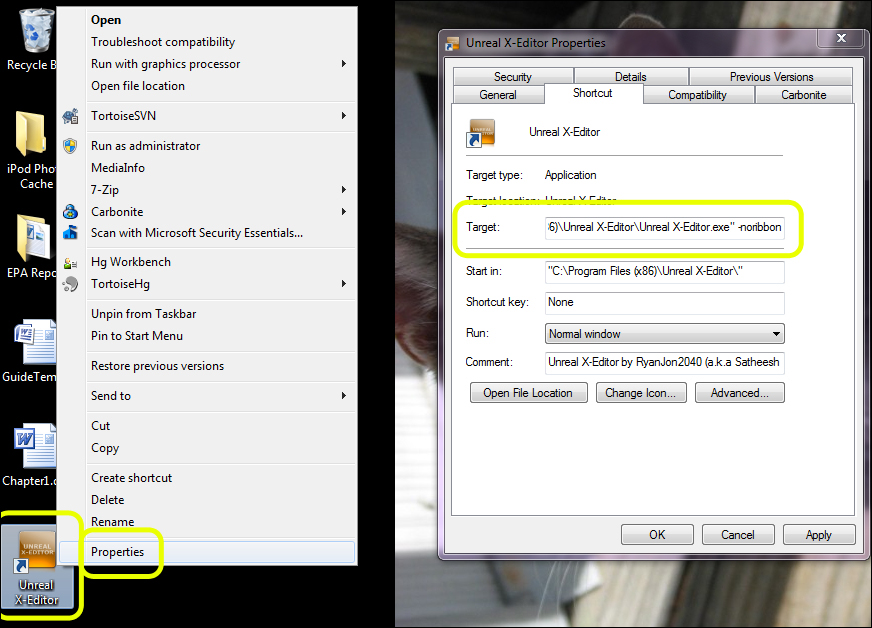 Right-click on the desktop shortcut and select Properties.