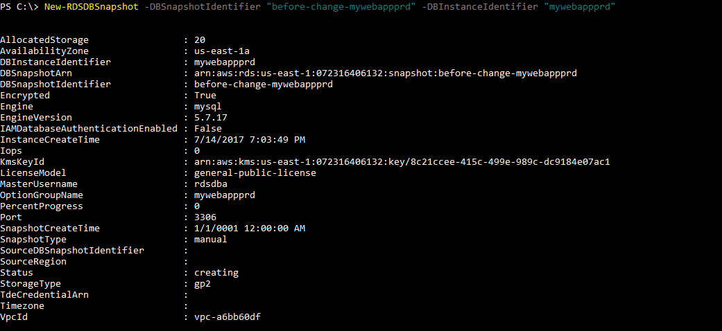 PS C:\> New-RDSDBSnapshot -DBSnapshotIdentifier "before-change-mywebappprd" -DBInstanceIdentifier "mywebappprd"