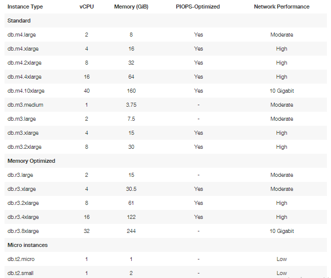 You have seen that when we work with EC2 instances, we have to choose the appropriate instance type to support the workload. In regard to EC2, the instance type provides you with the required amount of vCPU, memory, and bandwidth. Likewise, when you work with RDS, you have to choose the appropriate DB instance class. DB instance class also provide you with a choice to select the appropriate amount of vCPU, memory, and network speed. The following is a list of the DB instance classes supported on AWS. This list keep changing, so my advice is to review this one on the AWS website, available at https://aws.amazon.com/rds/details/. Only the Aurora database engine does not support all the DB instance classes. It only supports the r3 and t2 DB instance classes.