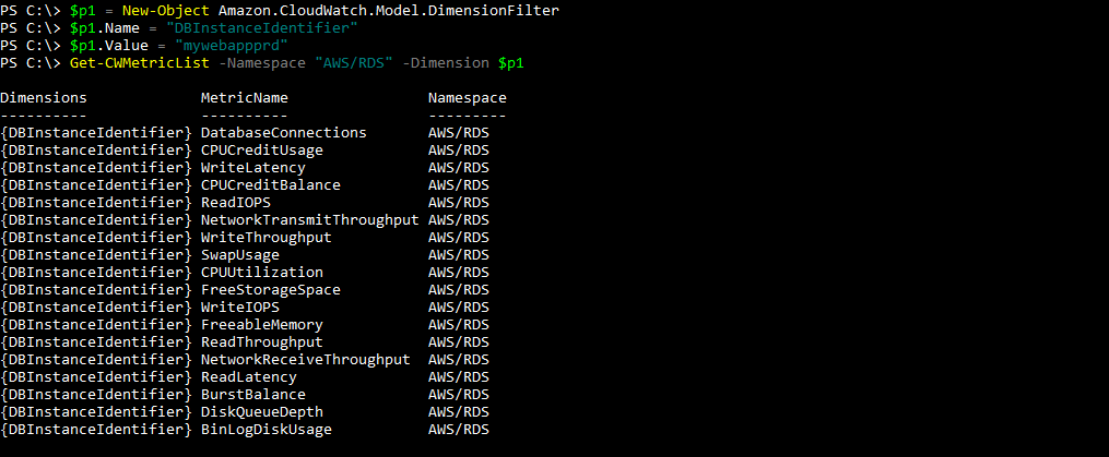 PS C:\> Get-CWMetricList -Namespace "AWS/RDS" -Dimension $p1