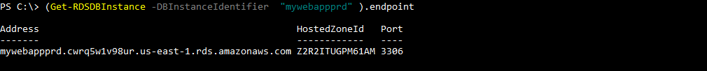 PS C:\> (Get-RDSDBInstance -DBInstanceIdentifier  "mywebappprd" ).endpoint