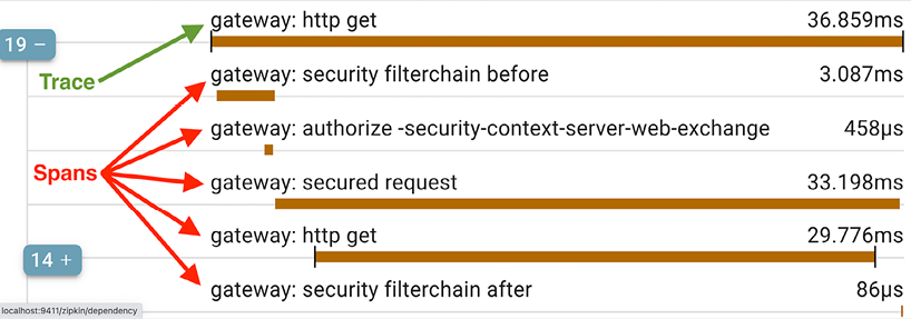 To recapitulate Chapter 8, Introduction to Spring Cloud, in reference to the Using Micrometer Tracing and Zipkin for distributed tracing section, the tracing information from a complete workflow is called a trace or a trace tree, and sub-parts of the tree – for example, the basic units of work – are called spans. Spans can consist of sub-spans forming the trace tree. Metadata can be added to a trace and its spans as key-value pairs called tags. The Zipkin UI can visualize a trace tree and its spans as follows: