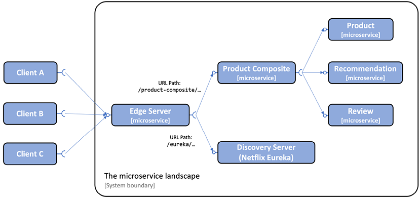 In this section, we will see how the edge server is added to the system landscape and how it affects the way external clients access the public APIs that the microservices expose. All incoming requests will now be routed through the edge server, as illustrated by the following diagram: